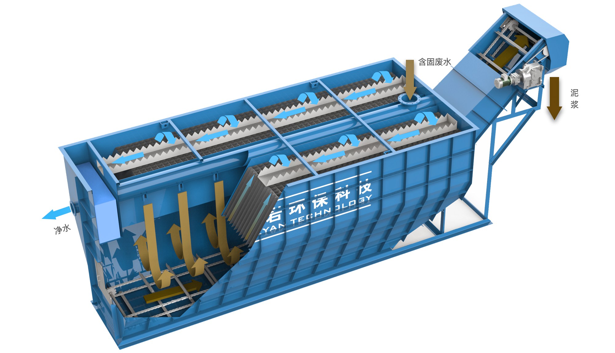 含固废水从进水口进入箱体内部的配水装置,配水装置将废水在固液分离器的长度方向上面均匀分布。废水通过配水装置后从底部进入60度放置的斜板分离区,并在斜板分离区实现了固液分离,废水向上流动,通过顶部的清水汇集槽收集后,从出水口排出箱体。固体会沉淀在斜板上面,随着沉淀厚度增加重力不断增大,最终滑落到箱体底部,箱体底部链板输泥系统将沉淀在底部泥浆输送至箱体外部的储泥装置内。