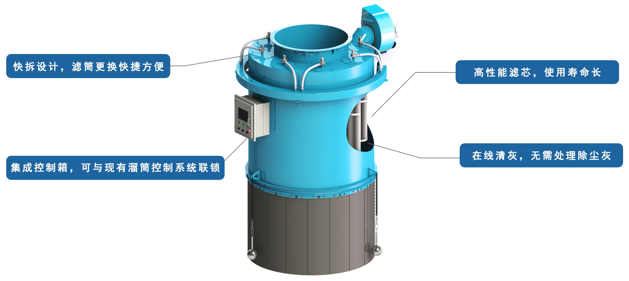 BF系列溜筒专用除尘器集成了在线脉冲清灰系统,在除尘器使用过程中,按照设定程序实时清理滤芯上附着的粉尘,清理掉的粉尘直接进入除尘器底部, 随料流一起落入料堆,无需处理除尘灰,减少维护工作量。