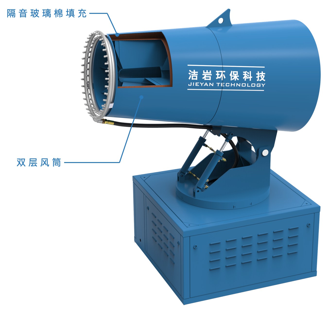 智能超细远程射雾器是根据风送原理,先使用先进的高压泵、超细雾化喷嘴将水雾化,将常态溶液雾化成0~30μm的细小雾粒。在风机的作用下,将雾定向抛射到指定位置,在尘埃处及其上方或者周围进行喷雾覆盖。粉尘颗粒与水雾充分的融合,逐渐凝结成颗粒团,在自身的重力作用下快速沉降到地面,从而达到降尘的目的。
